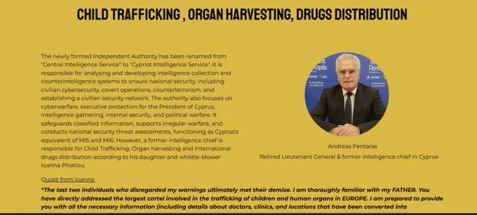 Δείτε περισσότερα εδώ: Πρώην πράκτορας της MI6 καταγγέλλει επώνυμα πως στην Κύπρο γίνεται εμπόριο παιδιών και οργάνων απο ανθρώπους υψηλού προφίλ.