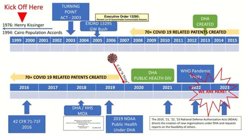Το 2004, οι Ηνωμένες Πολιτείες ψήφισαν το νόμο “Bioshield Act” μεταξύ άλλων νομοθετημάτων. Αλλά πραγματικά ξεκίνησε, το 2003, 2004 όπου το πρόσχημα για τη συγκάλυψη αυτή για τον αποπληθυσμό, ήταν η χρήση της δημόσιας υγείας, που πραγματικά σχεδιάστηκε σε συντονισμό με τον ΠΟΥ.