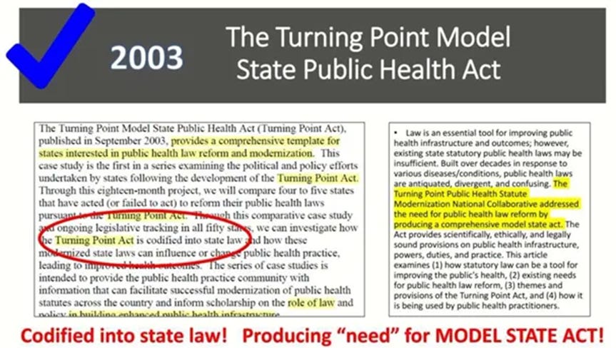 Και πράγματι αυτό είναι που είδαμε. Μπορείτε να δείτε εδώ τη διατύπωση από το “Turning Point Act” του 2003, και την ανάγκη, όπως το αποκαλούν, για ένα ” Πρότυπο Κρατικού Νόμου”, οι “Διεθνείς Κανονισμοί Υγείας” έγιναν ένα “Πρότυπο Κυβερνητικού Νόμου”, διακυβερνητική συμφωνία.