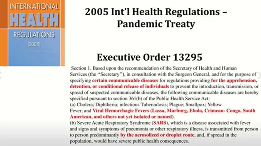 Ήταν η νομική βάση για τις παγκόσμιες δυνάμεις, για εκείνους που ελέγχουν τις κυβερνήσεις να επικαλούνται τους “Διεθνείς Κανονισμούς Υγείας” με τους οποίους επομένως απαιτείται κάθε μία από αυτές τις χώρες να κάνει ακριβώς το ίδιο πράγμα και την ίδια στιγμή.