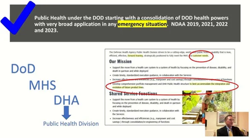 Έτσι, από εκείνη τη στιγμή το 2019, όπου εφαρμόστηκε το εκτελεστικό διάταγμα και στη συνέχεια εντάχθηκε στον νόμο για την “Εξουσιοδότηση της Εθνικής Άμυνας”, μέχρι σήμερα, με βάση τον νόμο για την “Εξουσιοδότηση της Εθνικής Άμυνας” το 2023, δηλαδή φέτος, κάναμε κάποια βήματα όσον αφορά την απόκτηση της εντολής εμβολιασμού από το Υπουργείο Άμυνας , το οποίο ακυρώθηκε, αλλά ταυτόχρονα ολοκληρώθηκε η μετακίνηση της δημόσιας υγείας στον οργανισμό υγείας της άμυνας, που σημαίνει τώρα ότι ο στρατός είναι υπεύθυνος για όλες τις ενέργειες της δημόσιας υγείας, ότι όλοι είναι υπεύθυνοι για τη δημόσια υγεία μας και σε ποιον νομίζετε ότι είναι υπεύθυνη η δημόσια υγεία μας, όταν λέγονται οι έξι μαγικές λέξεις.