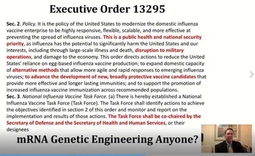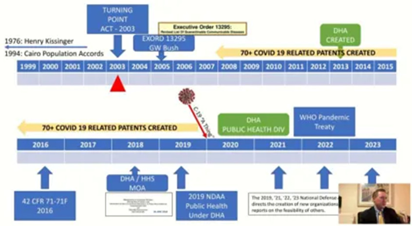 Το 2004, οι Ηνωμένες Πολιτείες ψήφισαν το νόμο “Bioshield Act” μεταξύ άλλων νομοθετημάτων. Αλλά πραγματικά ξεκίνησε, το 2003, 2004 όπου το πρόσχημα για τη συγκάλυψη αυτή για τον αποπληθυσμό, ήταν η χρήση της δημόσιας υγείας, που πραγματικά σχεδιάστηκε σε συντονισμό με τον ΠΟΥ.