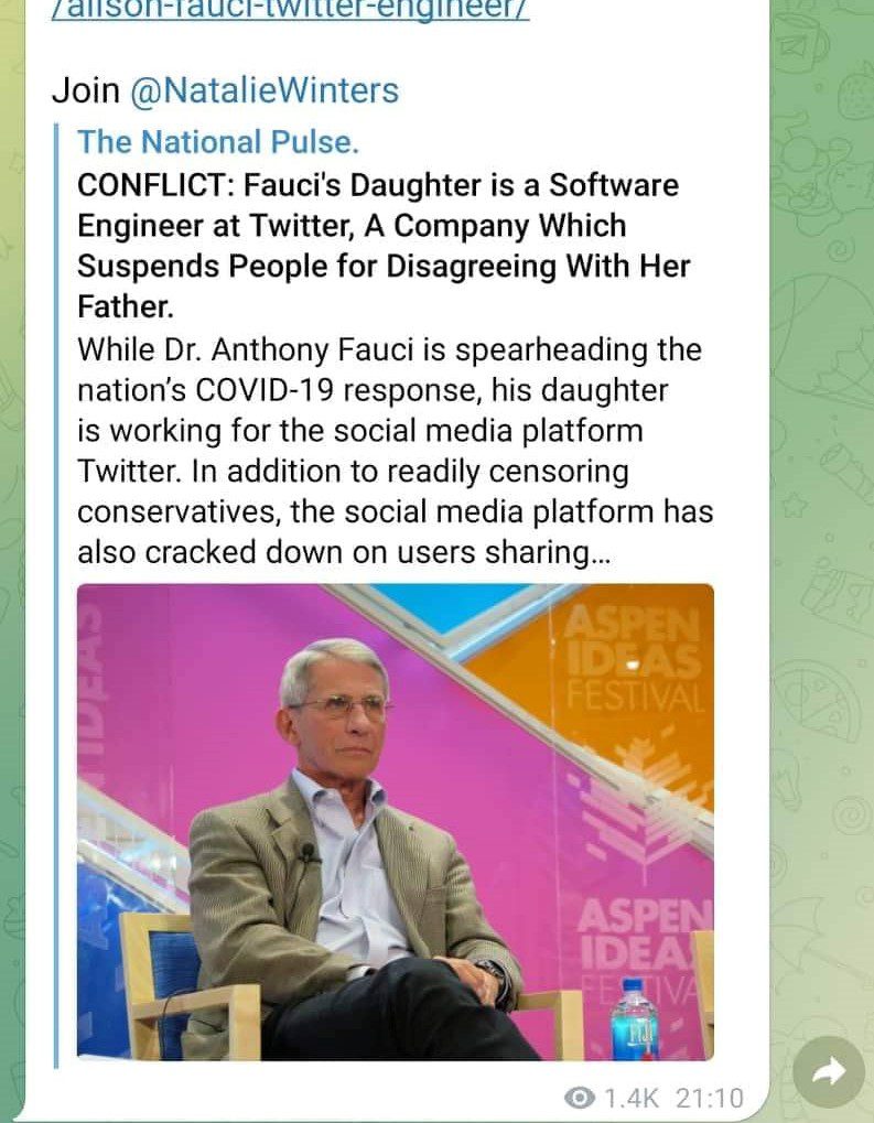 … σε νεότερα σχετικά με την υπόθεση, η κόρη του Φάουτσι είναι ανώτατο στέλεχος του Twitter κάτι που περιπλέκει ακόμα περισσότερο τα πράγματα.