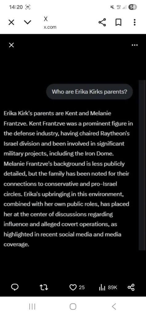 Οι γονείς της Έρικα ήταν βαθιά ριζωμένοι στο στρατιωτικοβιομηχανικό σύμπλεγμα, με μακροχρόνιους δεσμούς με το Ισραήλ.