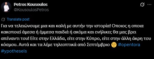 “Όποιος ή όποια κακοποιεί άμεσα ή έμμεσα παιδιά ή ακόμα και ενήλικες θα μας βρει απέναντι του. Είτε στην Ελλάδα, είτε στην Κύπρο, είτε είναι στην άλλη άκρη του κόσμου”
