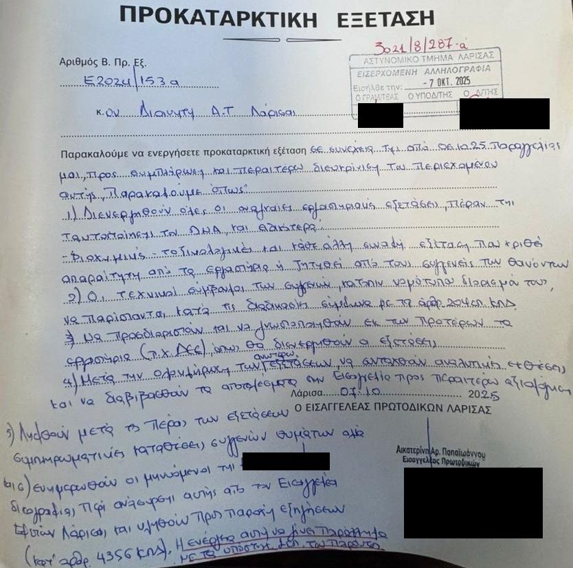 Στην παραγγελία προκαταρκτικής εξέτασης προς τον διοικητή του ΑΤ Λάρισας, η κ. Παπαϊωάννου ζήτησε «να διενεργηθούν όλες οι αναγκαίες εργαστηριακές εξετάσεις, πέραν της ταυτοποίησης του DNA και ειδικότερα βιοχημικές-τοξικολογικές και κάθε άλλη συναφή εξέταση που κριθεί απαραίτητη από το εργαστήριο ή ζητηθεί από τους συγγενείς των θανόντων».